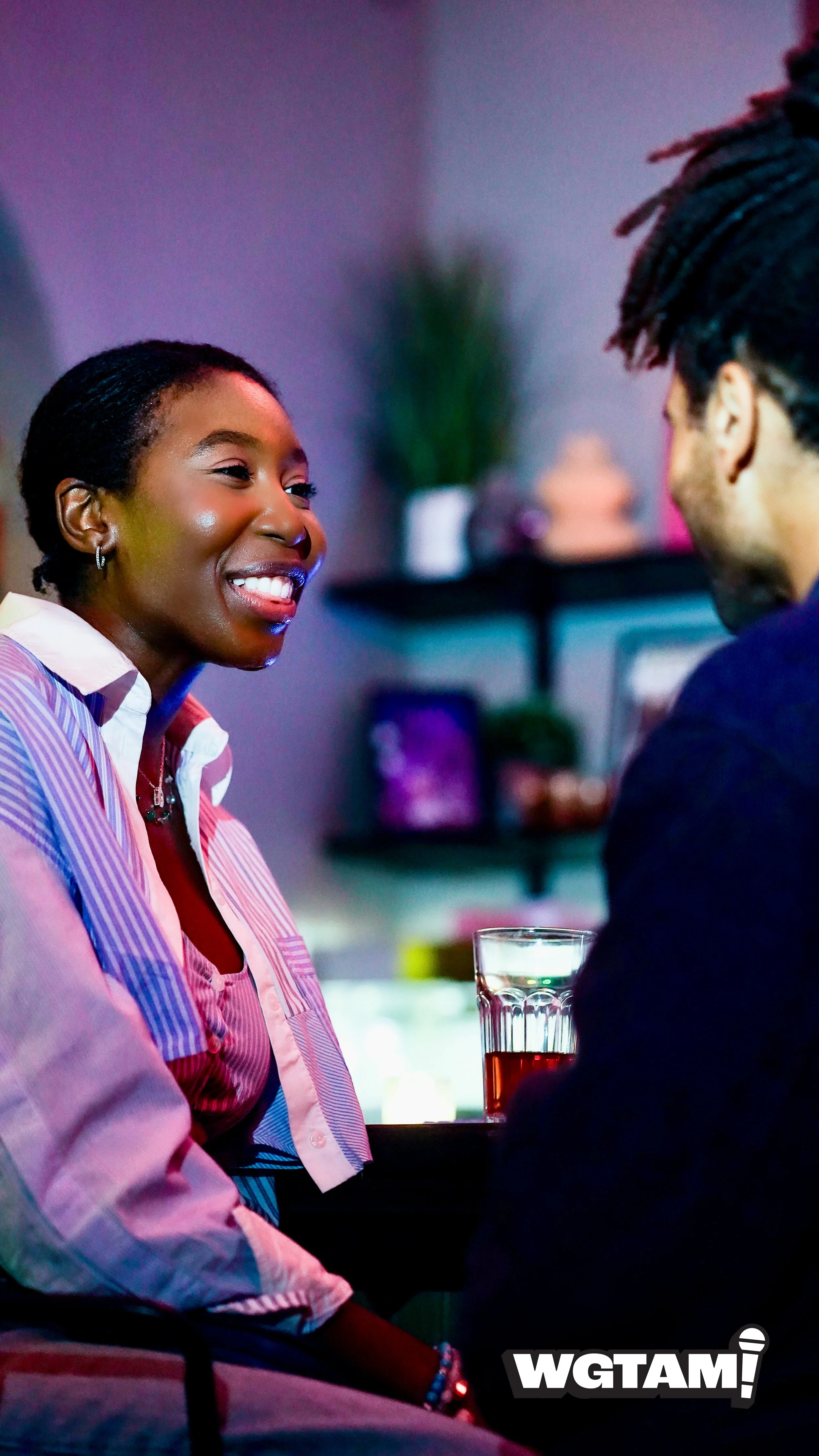 Two men are sitting at a table in a dimly lit venue, both laughing and enjoying drinks. The man on the left is wearing a black beanie, glasses, and a checked vest, while the man on the right is wearing a black beanie and black hoodie. There are several glasses and a menu on the table, and other people are visible in the background, some also laughing. The background features colorful artwork, a brick wall, and a neon sign.